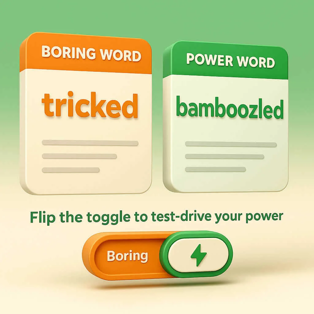 Students are presented with their chosen boring word alongside a stronger Power Word. This side-by-side display instantly makes the comparison clear and meaningful.